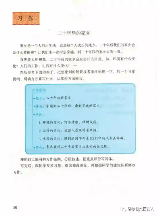 大胆想象二十年后家乡人、事、景、物的巨大变化,学习用人事景物表达对家乡的热爱、怀念之情。列出提纲,理清思路。