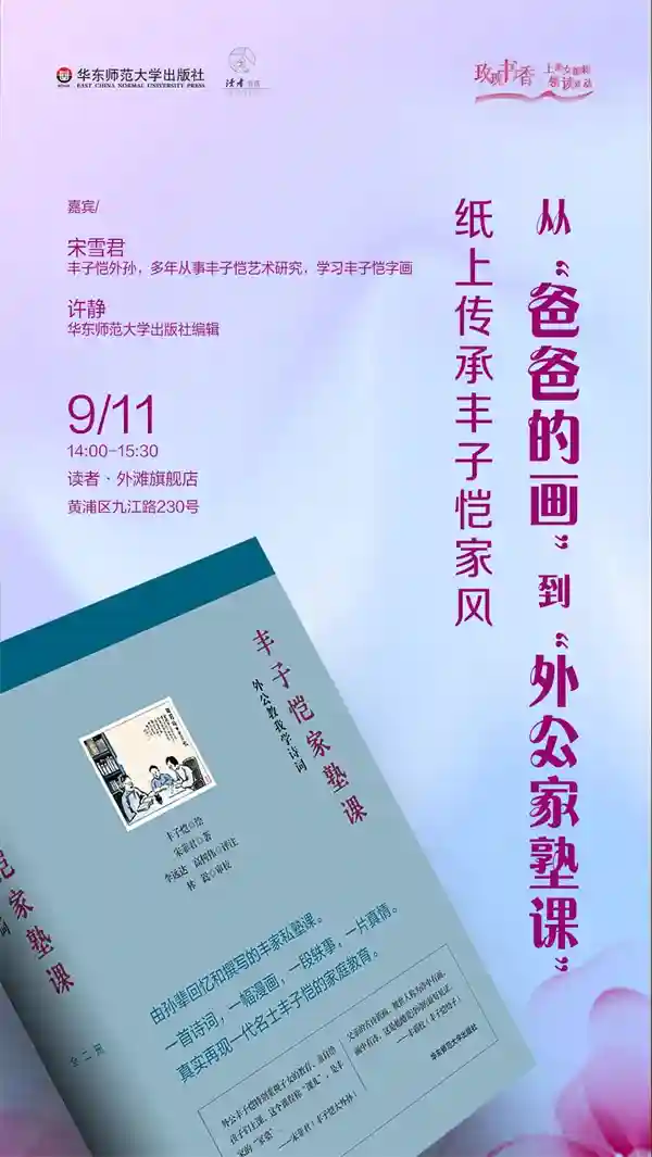 9月11日下午,我们邀请到了丰子恺外孙宋雪君先生和华东师范大学出版社许静女士,分别从两套书——《丰子恺家塾课:外公教我学诗词》和《爸爸的画》——谈起,共话丰家教育和家风传承,以及在这一过程中,出版是如何承担社会责任和文化责任的。