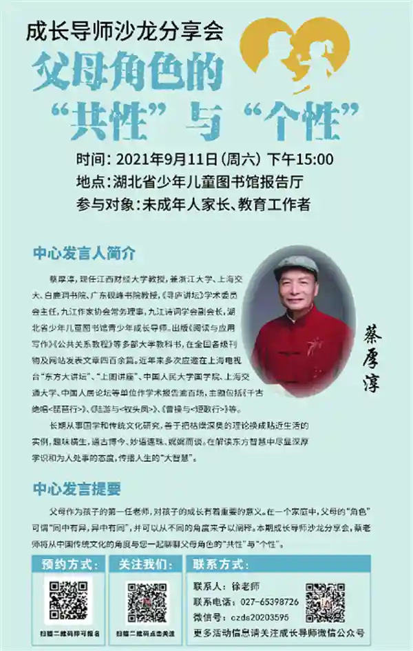 父母作为孩子的第一任老师,对孩子的成长有着重要的意义。在一个家庭中,父母的“角色”可谓“同中有异,异中有同”,并可以从不同的角度来予以阐释。本期成长导师沙龙分享会,蔡老师将从中国传统文化的角度与您一起聊聊父母角色的“共性”与“个性”。