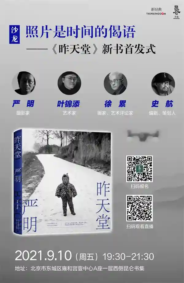 严明在他的全新摄影集《昨天堂》中说:“照片是时间的偈语,每一声快门都是送别。”无论是消逝或正在消逝的人文景观,还是严明这二十余年的摄影人生,严明的每一张照片都仿佛是在与过去作别,它们是时间馈赠给严明的礼物,也是对我们时间必会消逝的提醒。9月10日晚,侯登科奖得主、摄影家严明将携最新摄影作品集《昨天堂》,与艺术家叶锦添、徐累,编剧史航做客昆仑书集,一起畅谈他们眼中的传统人文与摄影艺术,从不同角度聊聊严明新摄影风格的演进,分享他们体会到的时间与艺术的故事。
