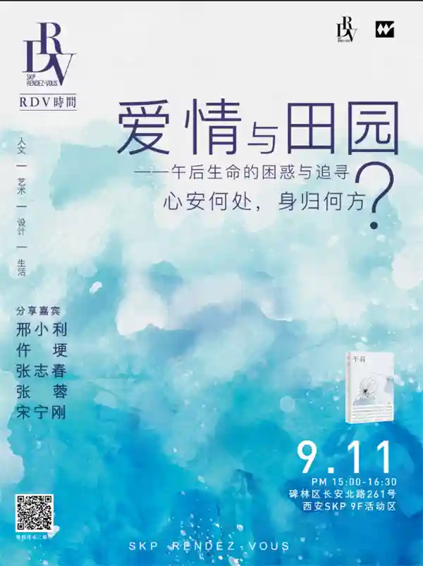 《午后》写的是几个不同性格的知识分子,行至生命的“午后”,来路一片斑驳,而去路一片苍茫之时,所经历的生活和故事。邢小利的这部长篇小说,写的和探讨的,主要是爱情和田园,这是文学的两个永恒主题,也是人类的两个终极价值。9月11日下午,我们邀请邢小利做客西安SKP,与仵埂、张志春、张蓉、宋宁刚几位嘉宾一起,分享《午后》中的爱情与田园。