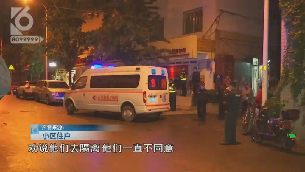 从画面中可以看到,龙跃小区门口的道路上停着一辆救护车,一名身穿防护服的医护人员下车与一旁的民警交谈,周围聚集着不少围观的市民。小区住户告诉记者,听说这家人的女儿刚从泰国回来,才玉溪隔离了一周,就接回昆明,社区追踪到行程后,就劝他们去隔离,但他们一直不同意。
