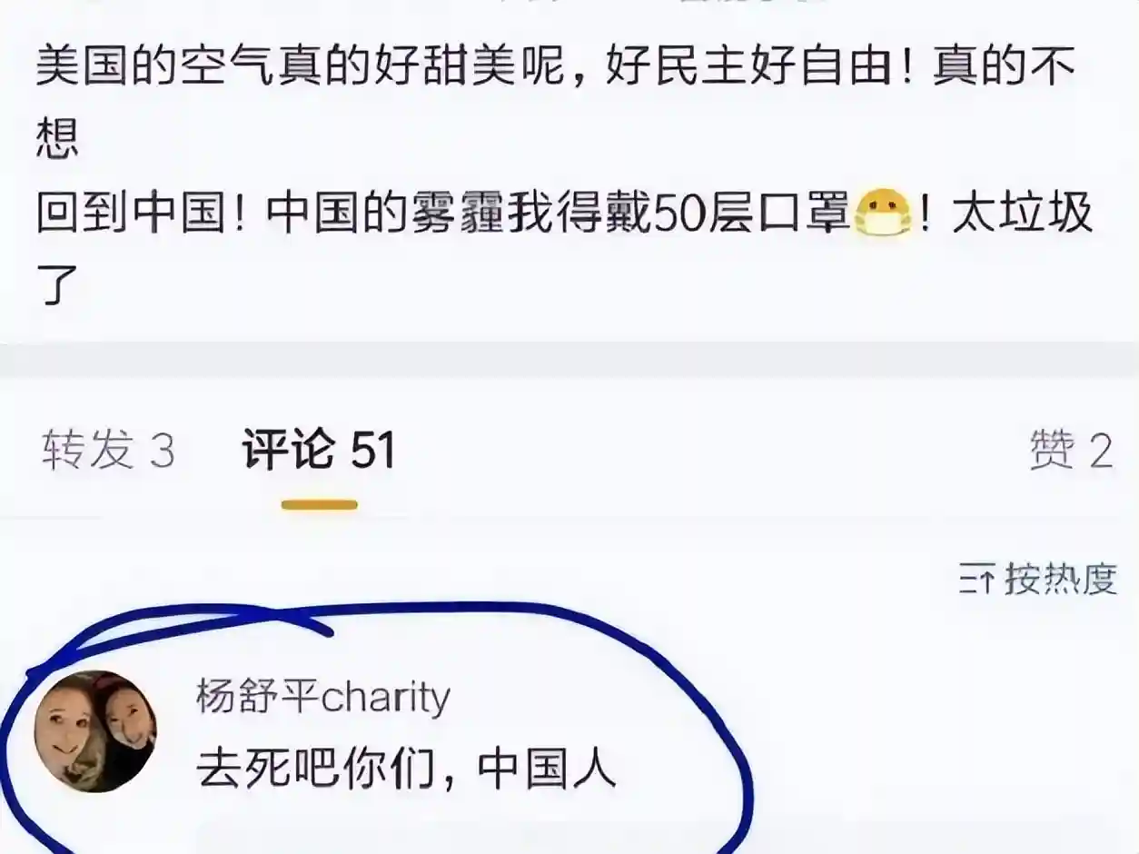 于是,“跪舔”风波过去没多久,杨舒平头贴“美籍达人杨舒平”的标签,再次在网上“作妖”:“美国屎都是香甜的,去死吧,中国人。”“不要嫉妒我取得美国绿卡哦,你们滚吧,中国人!”