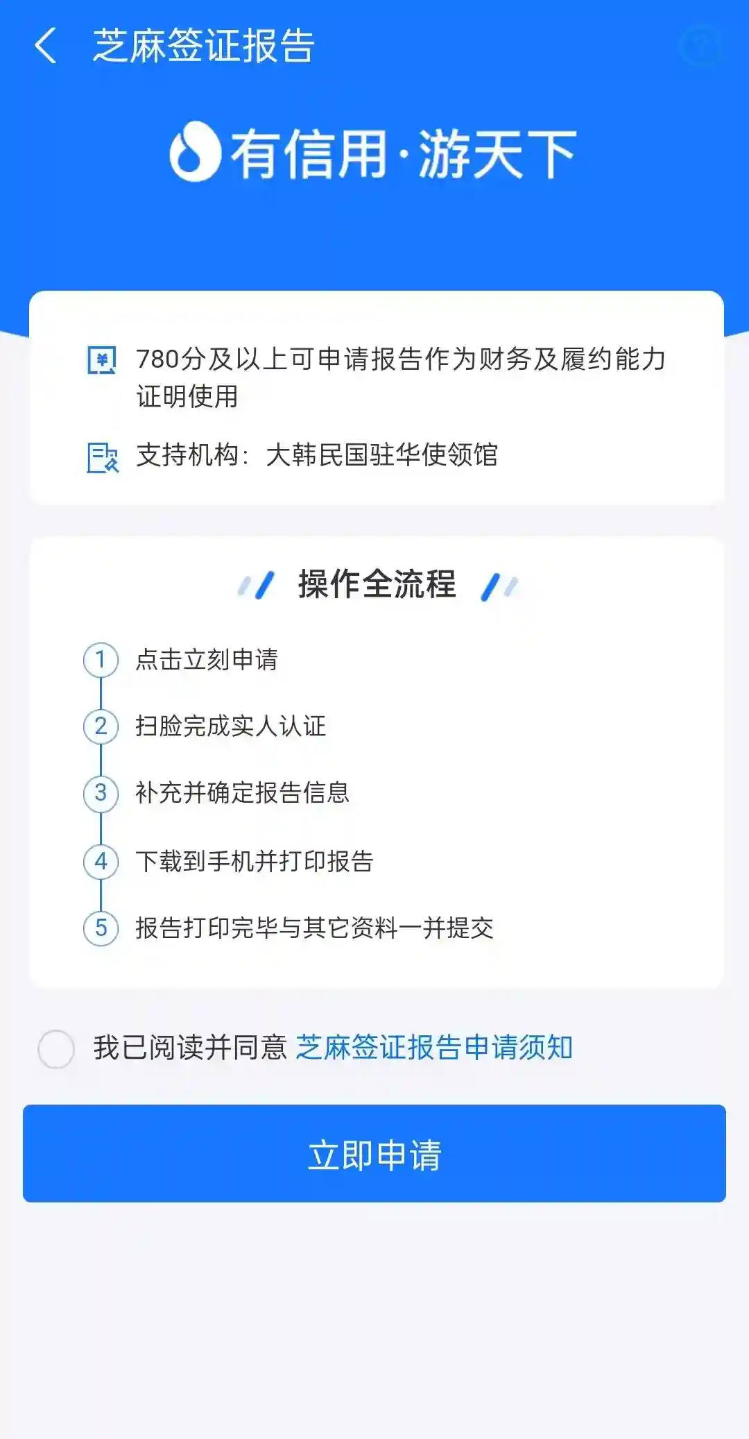 *芝麻签证报告可在支付宝APP进行下载步骤:芝麻信用-芝麻超能力-速办-材料减免-选择“韩国”-下载芝麻签证报告并打印施行日:自2022年8月18日起