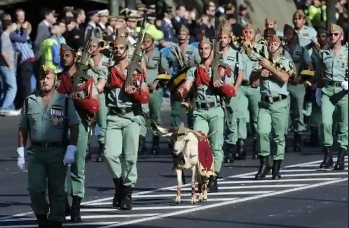 那大家感兴趣的为什么外籍军团会牵着公羊呢?以往的每年西班牙的国庆节阅兵式上最奇异的焦点就是那只公羊。公羊是西班牙海外军团(Legion)的吉祥物,西语叫LaCabradelalegión(海外军团的公羊)。