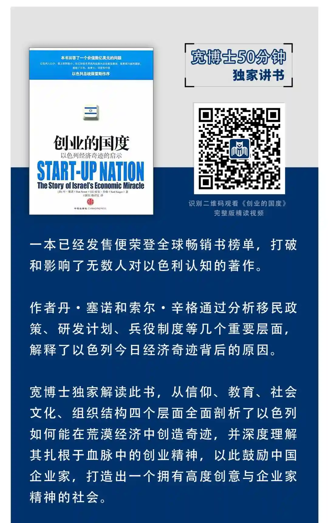 宽博士独家解读此书,从信仰、教育、社会文化、组织结构四个层面全面剖析了以色列如何能在荒漠经济中创造奇迹,并深度理解其扎根于血脉中的创业精神,以此鼓励中国企业家,打造出一个拥有高度创意与企业家精神的社会。