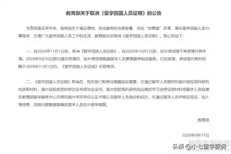 根据中华人民共和国教育部在2020年9月17日发布的公告,自2020年11月1日起,取消《留学回国人员证明》。自2020年10月1日起,驻外使领馆不再受理开具申请。2020年9月30日前已提交申请的,驻外使领馆根据留学人员意愿提供相应服务。已经受理、使领馆开具时间晚于2020年11月1日的,《留学回国人员证明》仍然有效。