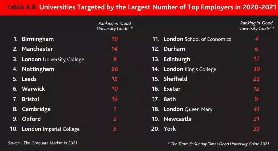其中最受最佳雇主们追捧的十所大学分别是伯明翰大学、曼彻斯特大学、伦敦大学学院、诺丁汉大学、利兹大学、华威大学、布里斯托大学、剑桥大学、牛津大学和帝国理工学院。