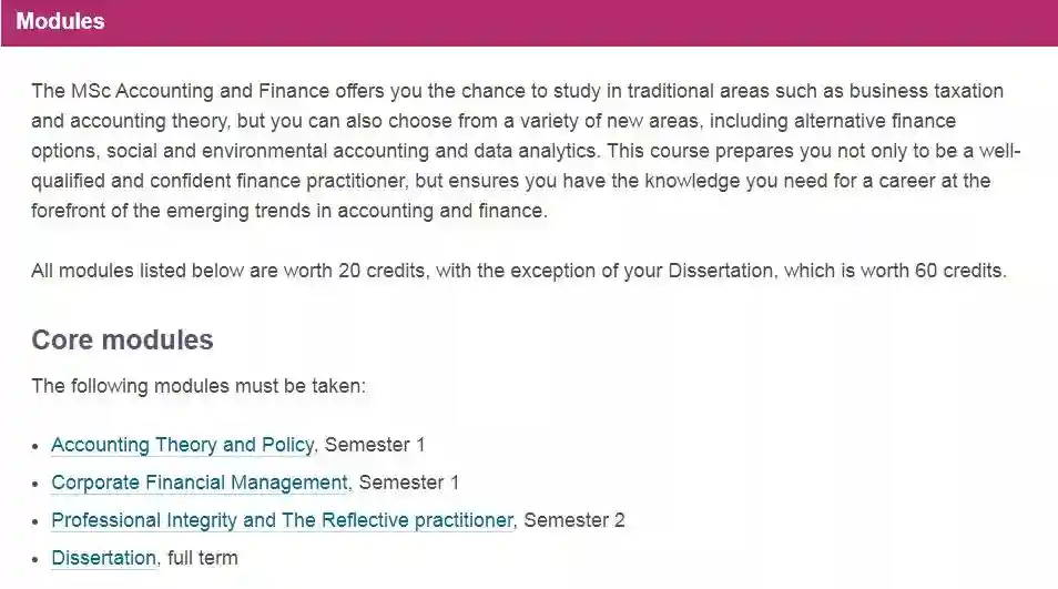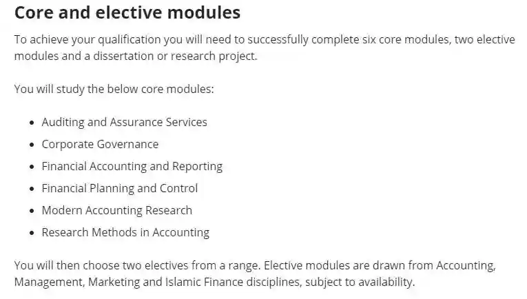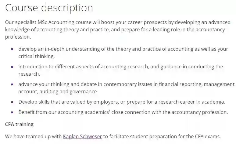 该课程主要帮助学生了解和应用会计和金融理论,理解应用国际会计准则,批判性评估财务报表信息,以及评估和比较不同的投资,让学生对该学科领域有更深层次的认识。但申请时,学校还是对学生的专业背景有要求。