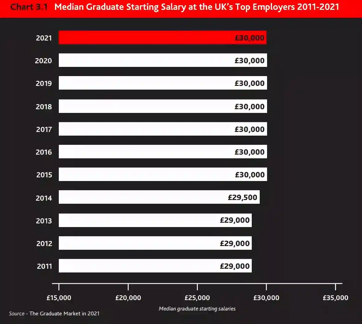 此外,就业后的薪资水平也相当重要。自2009年以来,全行业毕业生起薪变动幅度不大,其中2015年至2021年一直保持在30,000英镑的平均值水平。