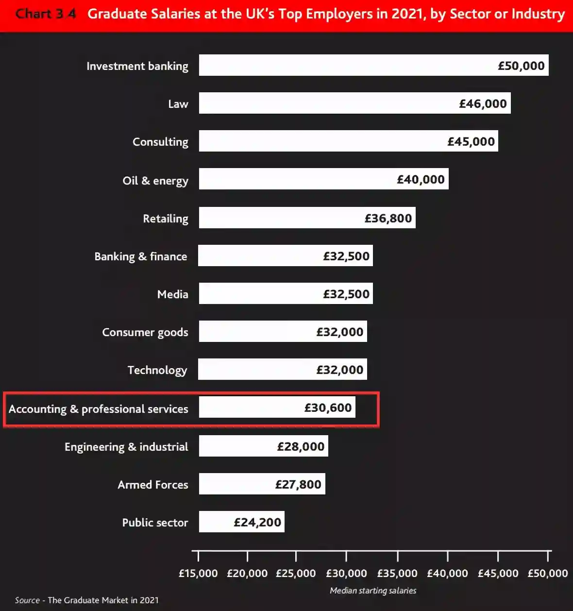 会计的毕业生薪酬比平均数高了一点点,薪资中位数为30,600英镑。毕业生薪酬最高的行业是投资银行,其薪资中位数是50,000英镑。