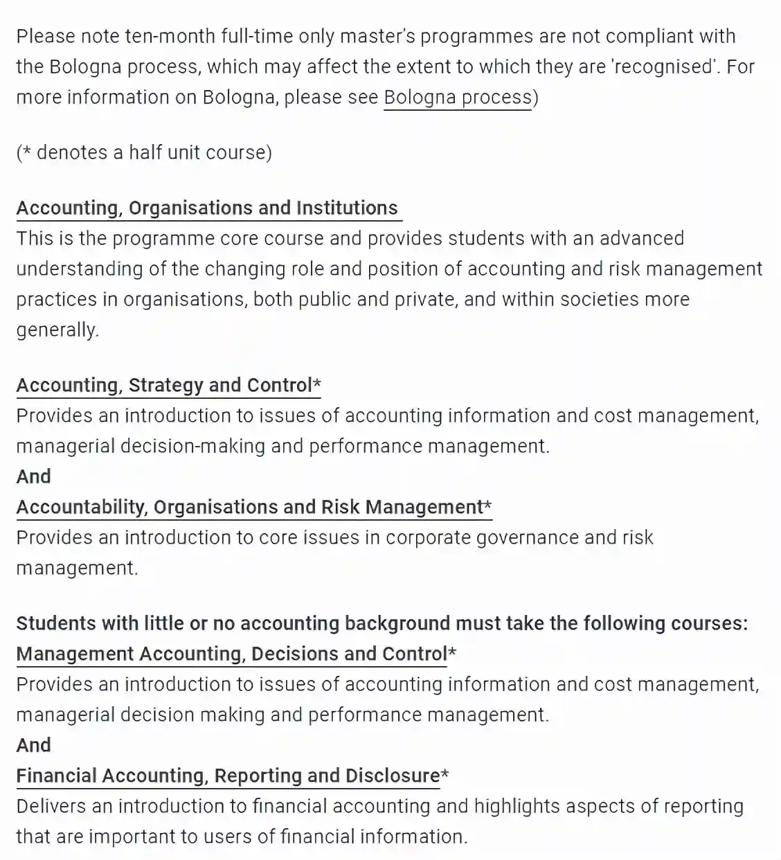 这个项目的核心课程教授与会计、风险管理、组织绩效和问责制体制框架之间的相互关系。申请此项目,会计背景并非必备条件,甚至非常鼓励那些有人文、社会或自然科学背景且有较好论文写作能力的学生申请。当然,该项目也非常适合那些希望深入了解会计组织和制度背景,具有会计背景的学生。