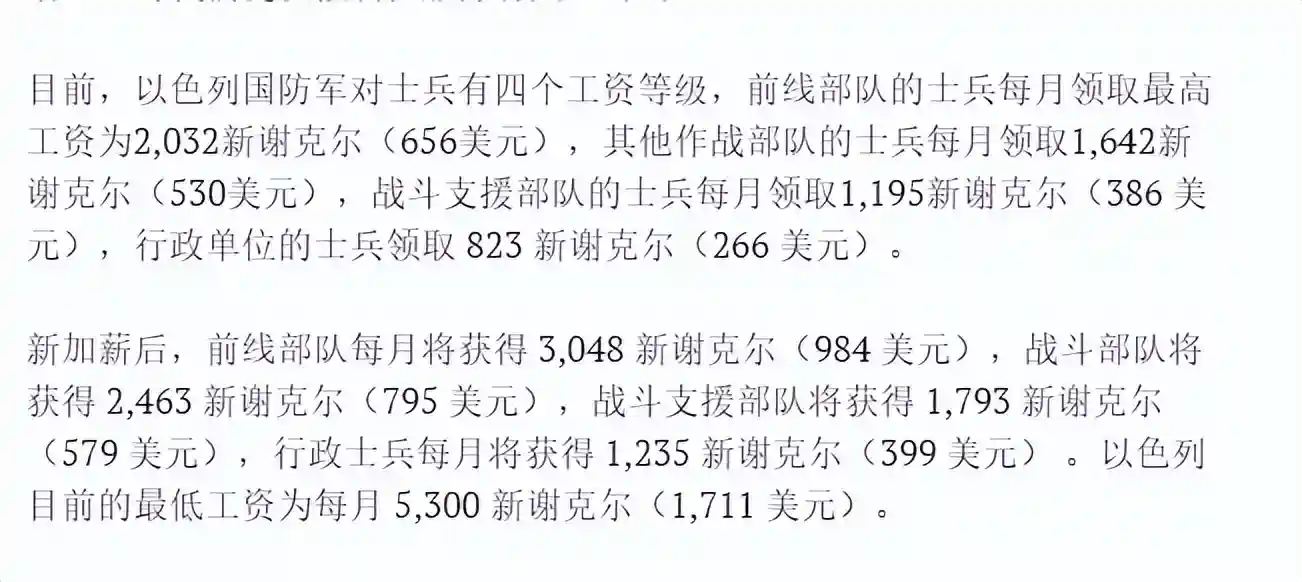 以色列国防预算被削减造成的直接后果是现役以军士兵待遇下降、预备役训练被叫停:2021年以军前线部队每月津贴约在579美元到984美元之间,而当时以色列的最低工资为1700美元左右。