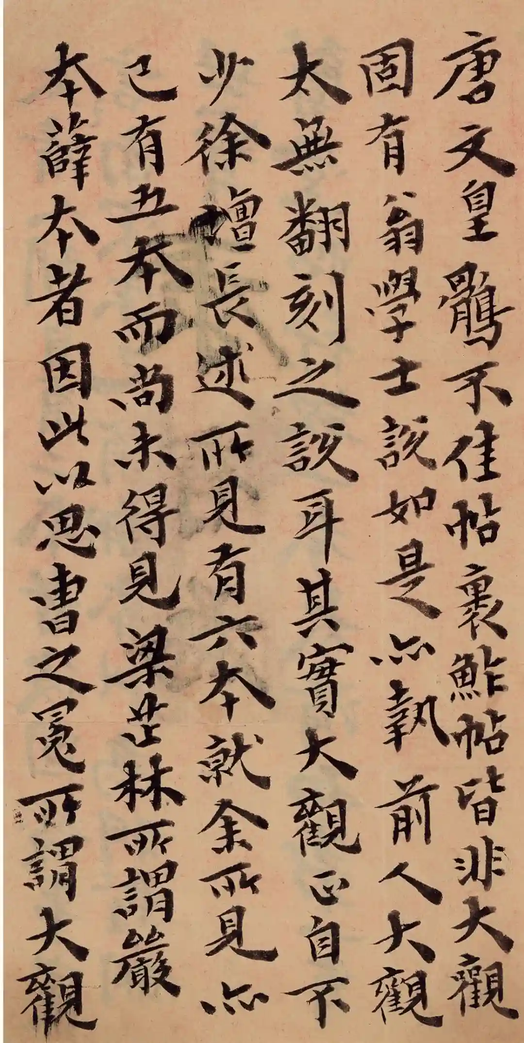 释文:《祭侄文》,停雲勒石太精,行笔太整,既非鲁国本色,亦非稿草匆匆,简率之致,及玩此本,秃毫可掬,首行黯淡,次行以下方就少浓,行间往往露燥笔。