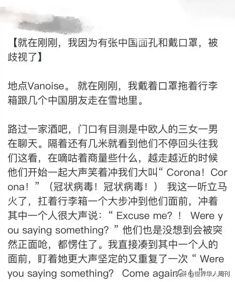 因此在法国、英国以及意大利,每当人们看到中国留学生戴着口罩,他们都会投以异样的目光,一些挑事者甚至还会指责他们“造成恐慌”,或诬蔑其为“病毒携带者”,应该“滚回中国”。
