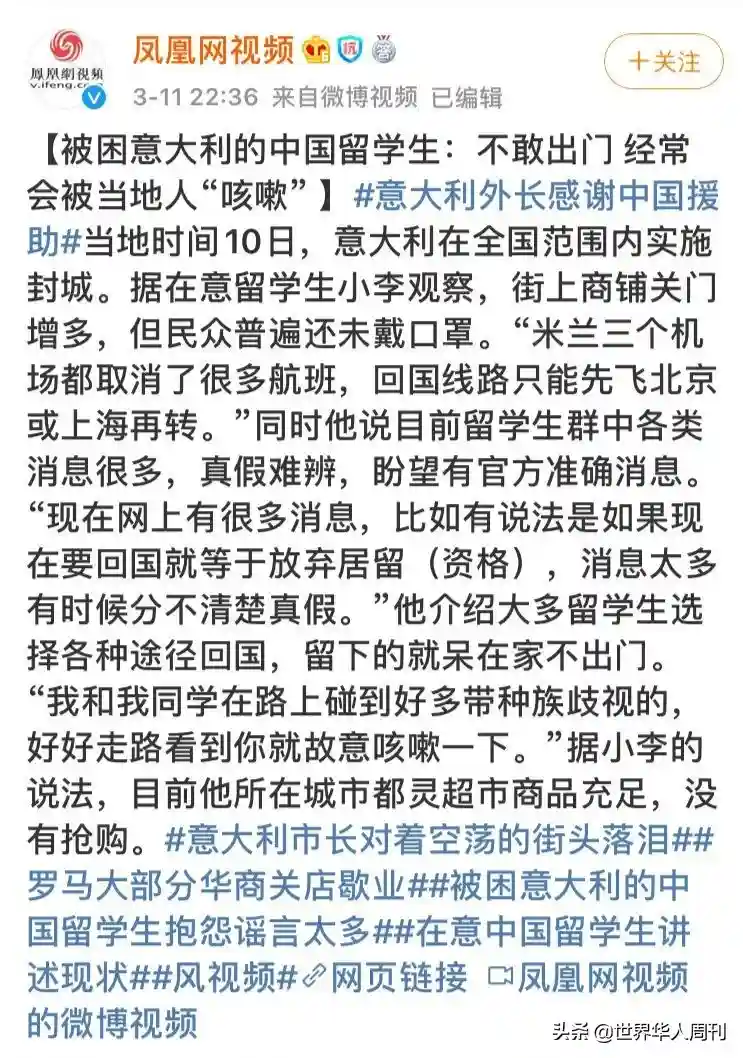 困在意大利的中国留学生小李,讲述了他的近况,“我和我同学在路上碰到好多带种族歧视的,好好走路看到你就故意咳嗽一下。”