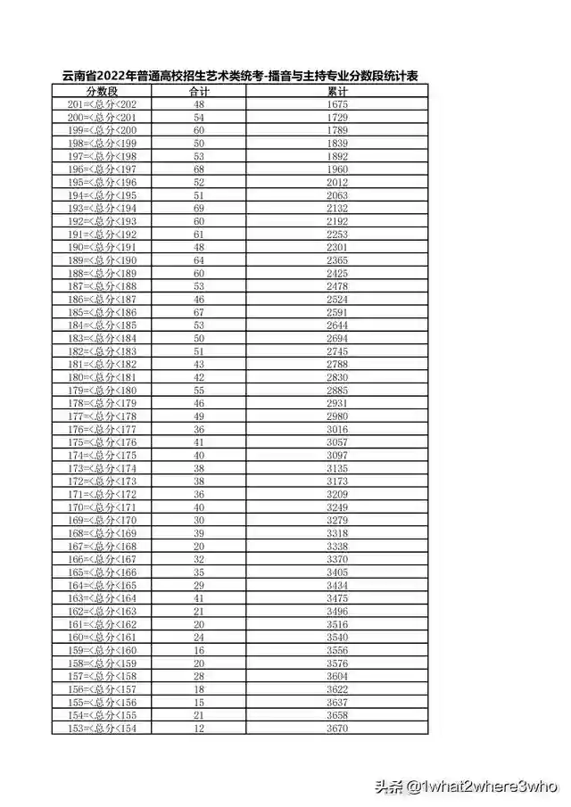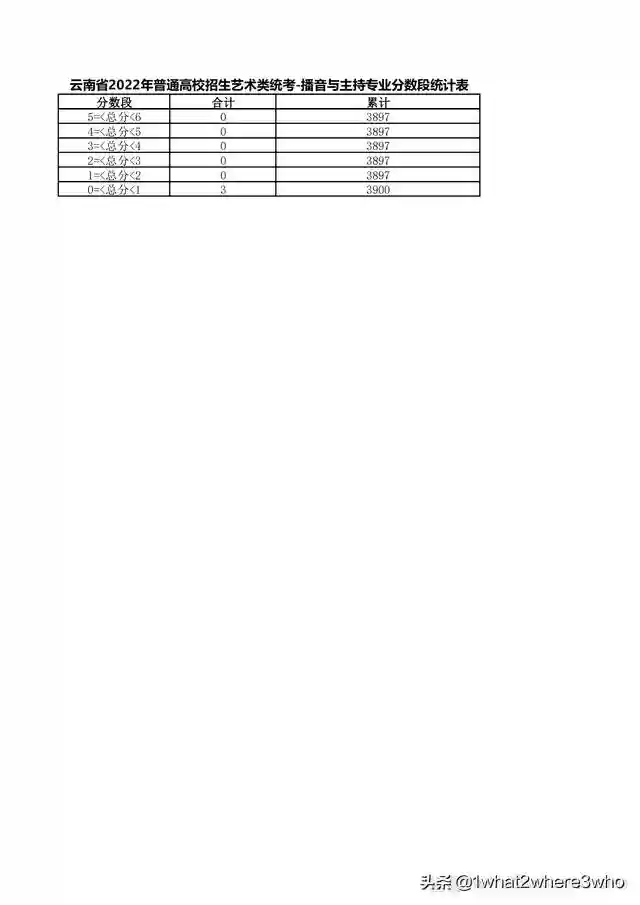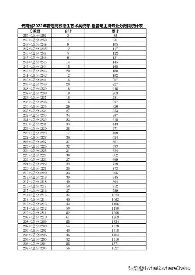 云南省2022年艺术类播音与主持专业统考总分分数段统计表