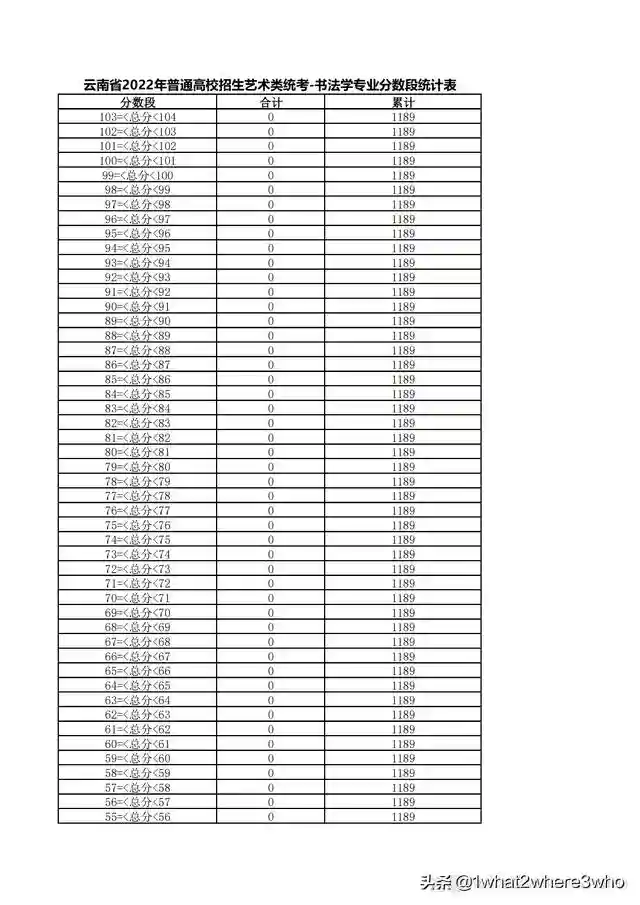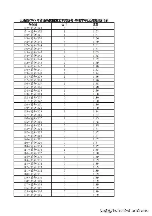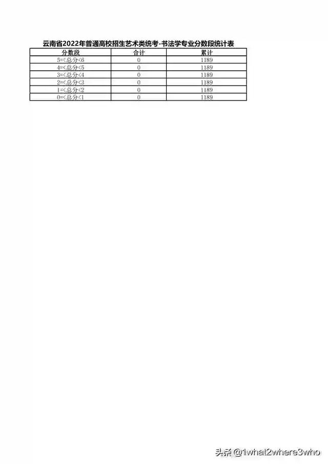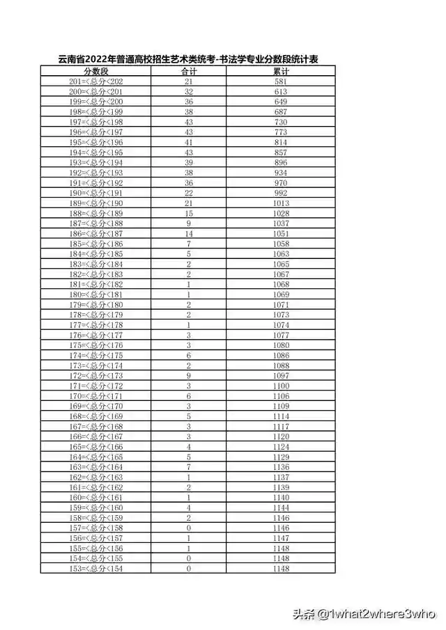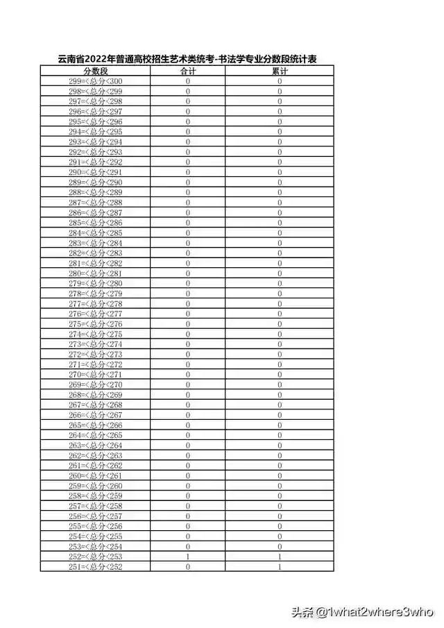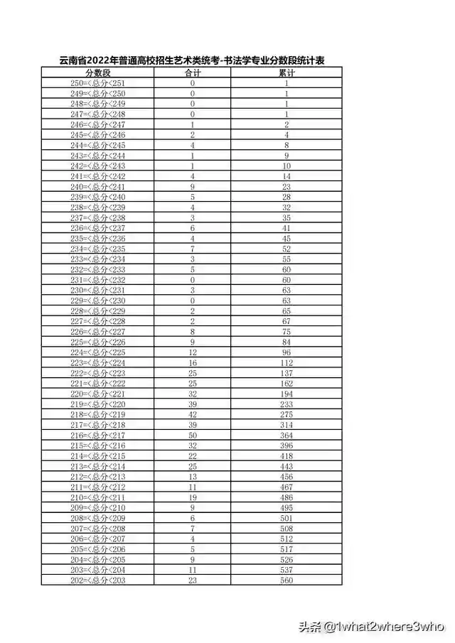 云南省2022年艺术类书法学专业统考总分分数段统计表