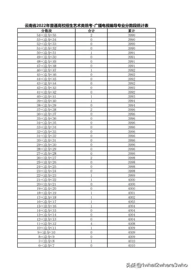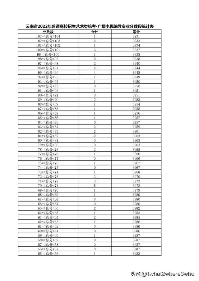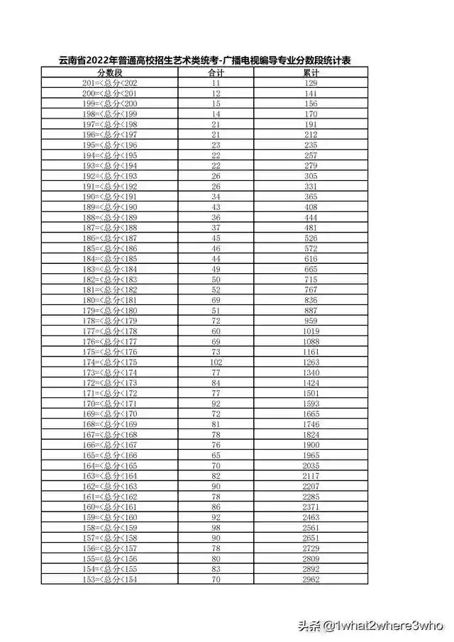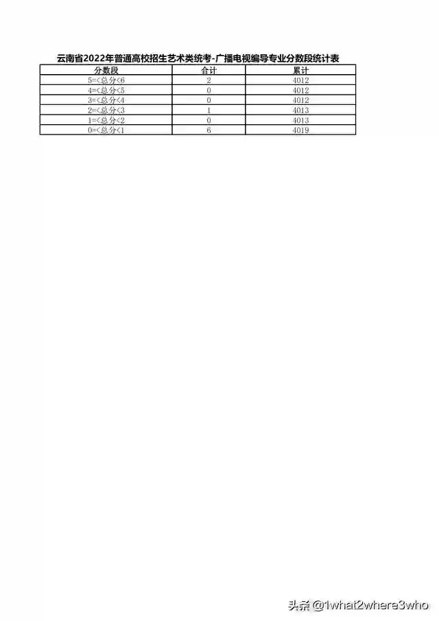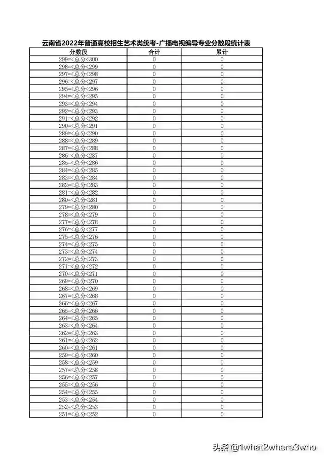 云南省2022年艺术类广播电视编导专业统考总分分数段统计表