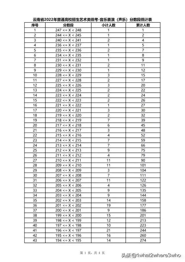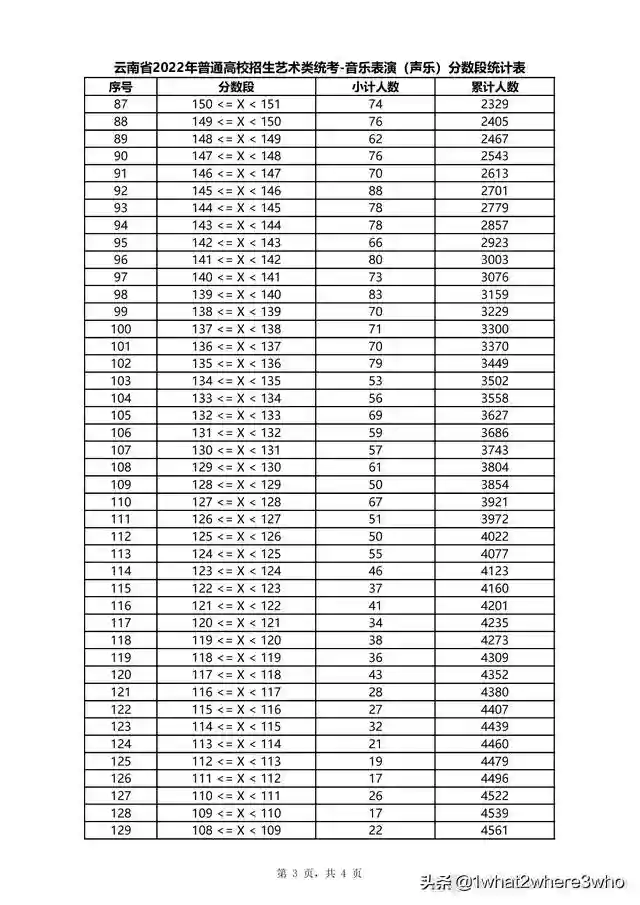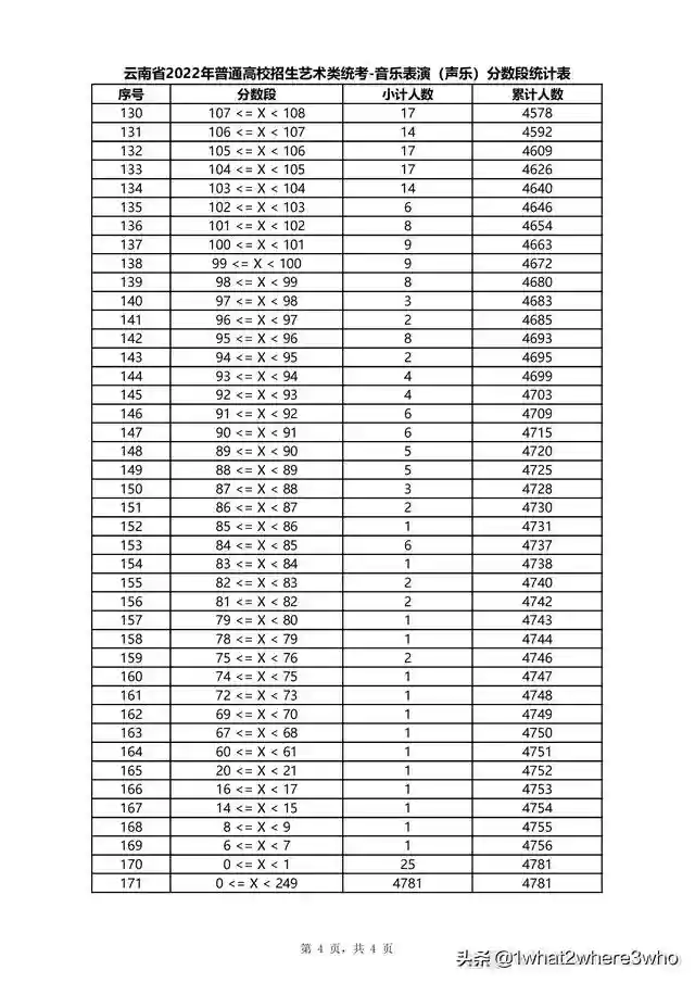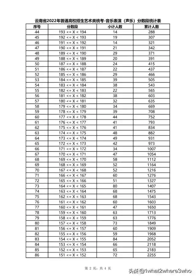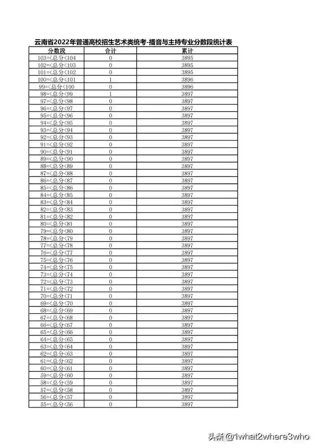 云南省2022年普通高校招生声乐类统考分数段统计表