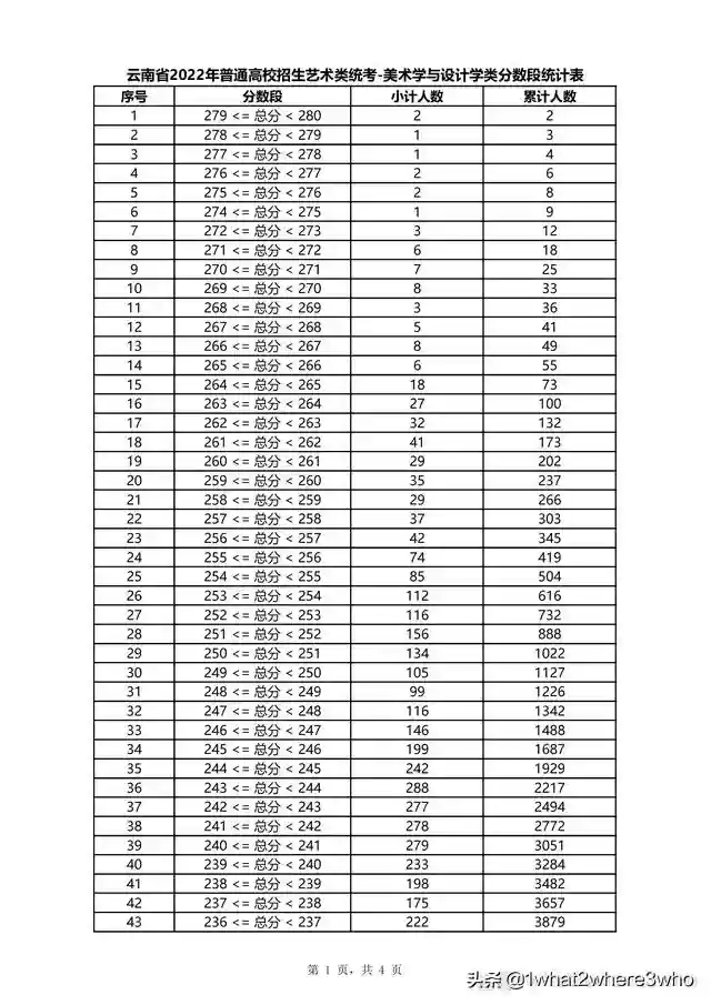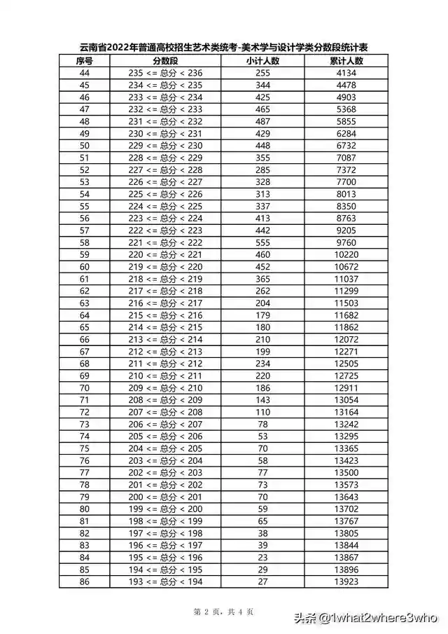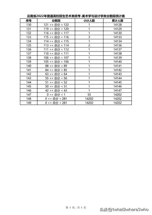云南省2022年普通高校招生美术学与设计学类统考分数段统计表
