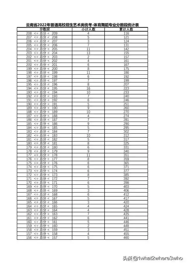 云南省2022年体育舞蹈统考总分分数段统计表