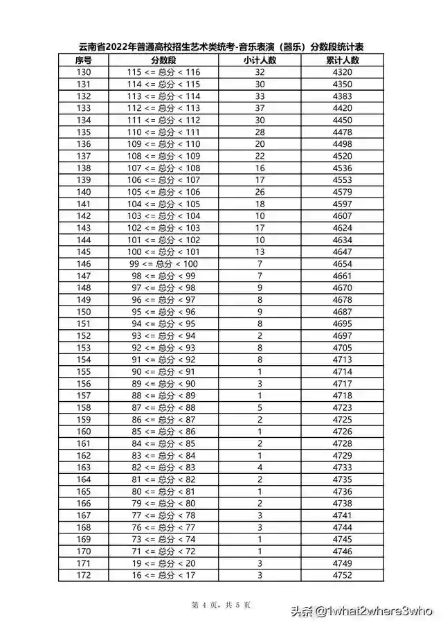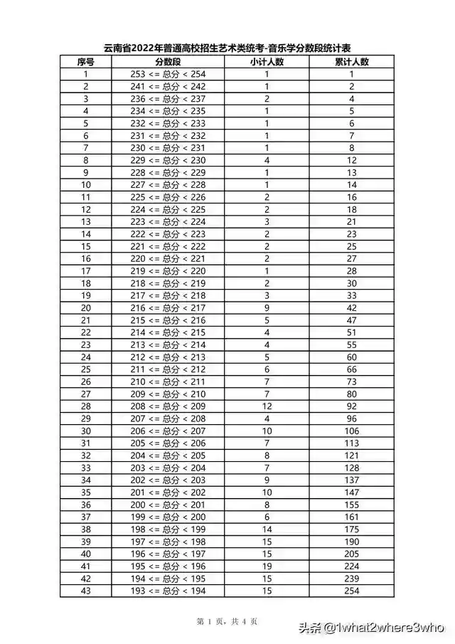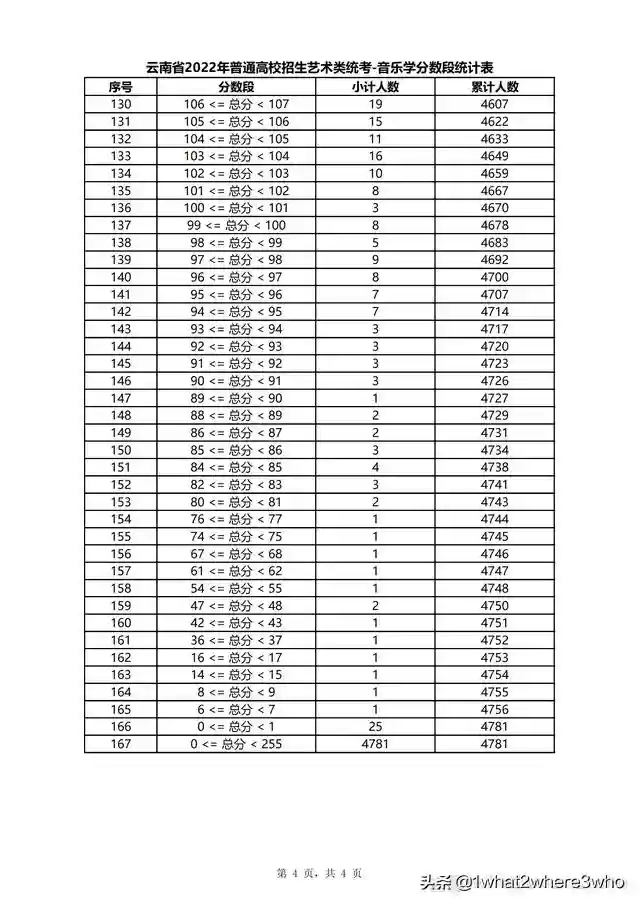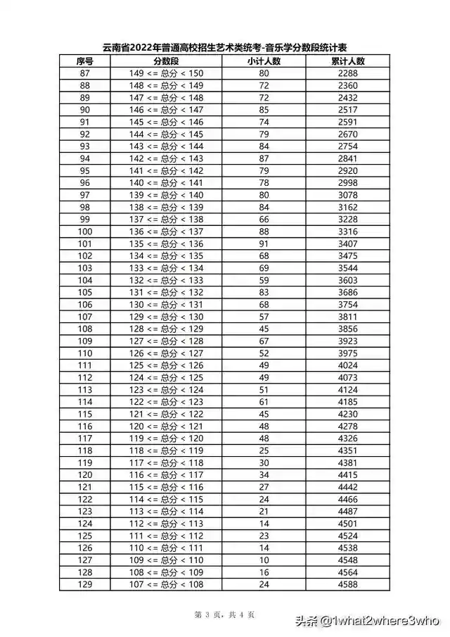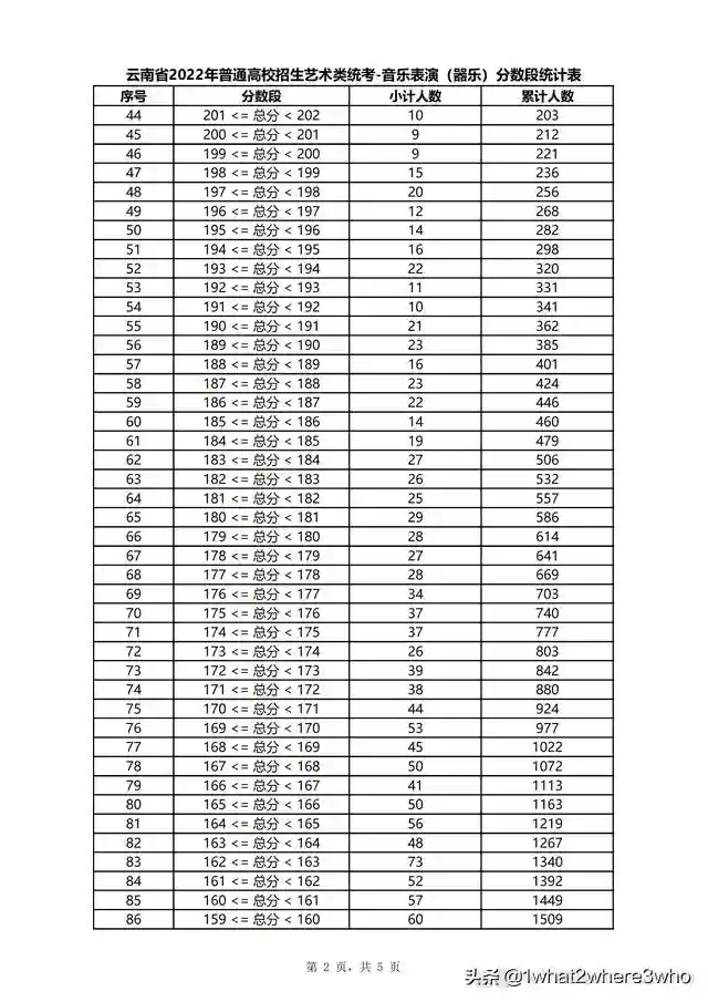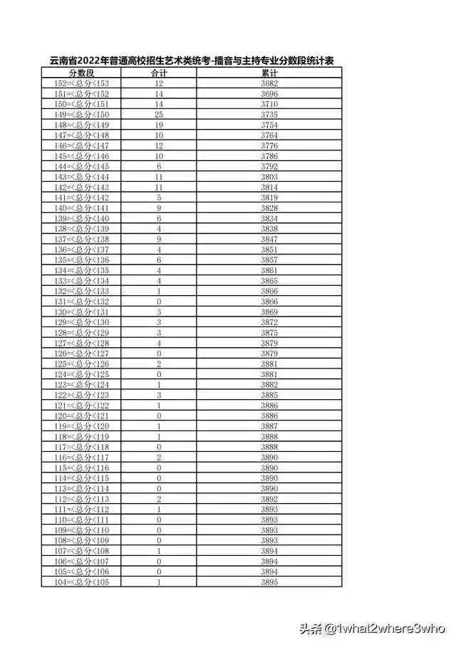云南省2022年普通高校招生音乐学类统考分数段统计表