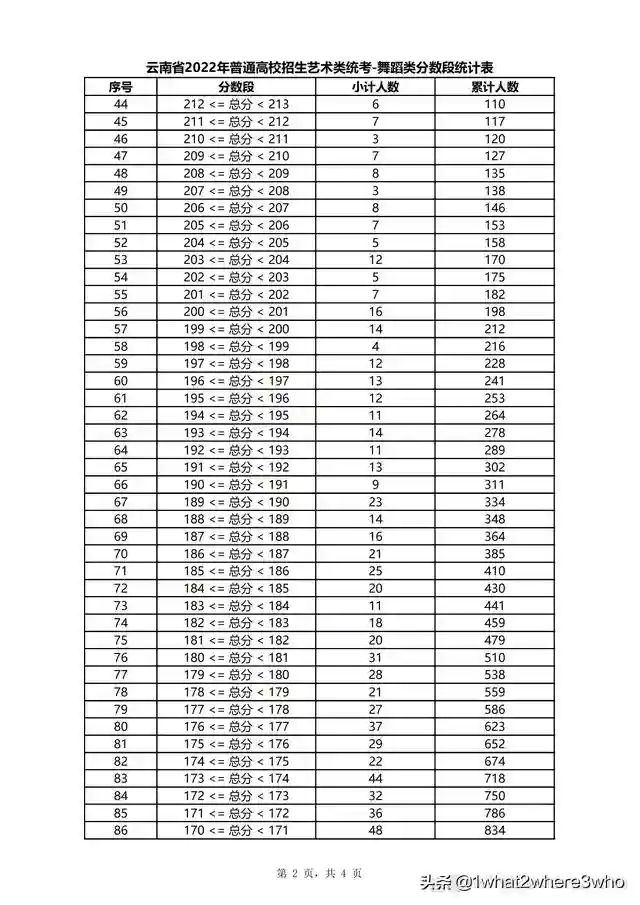 云南省2022年普通高校招生舞蹈类统考分数段统计表