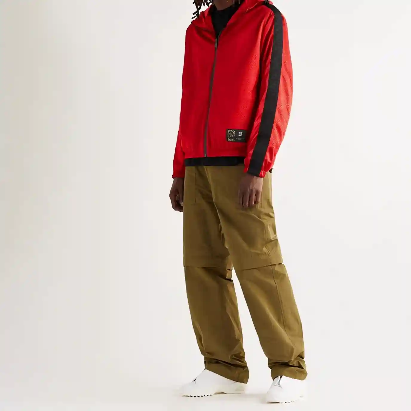 简单不过的过头笠设计,同时于白色褛风上缀以红绿横间,低调之余也能合于不同场合穿。