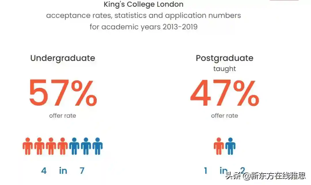 根据英国AdmissionReport官网发布的数据统计,从2013-2019年,伦敦国王学院的平均录取率,无论是研究生还是本科生都有将近50%。
