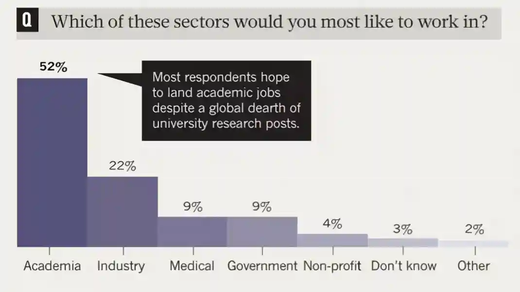 根据Nature对5700名博士研究生的公开调查数据显示,研究生出现焦虑和抑郁的比例,比普通人群要高六倍,其中有将近52%的人希望自己能够在未来的学术当中谋得一席之地,但是现实却将他们打醒。