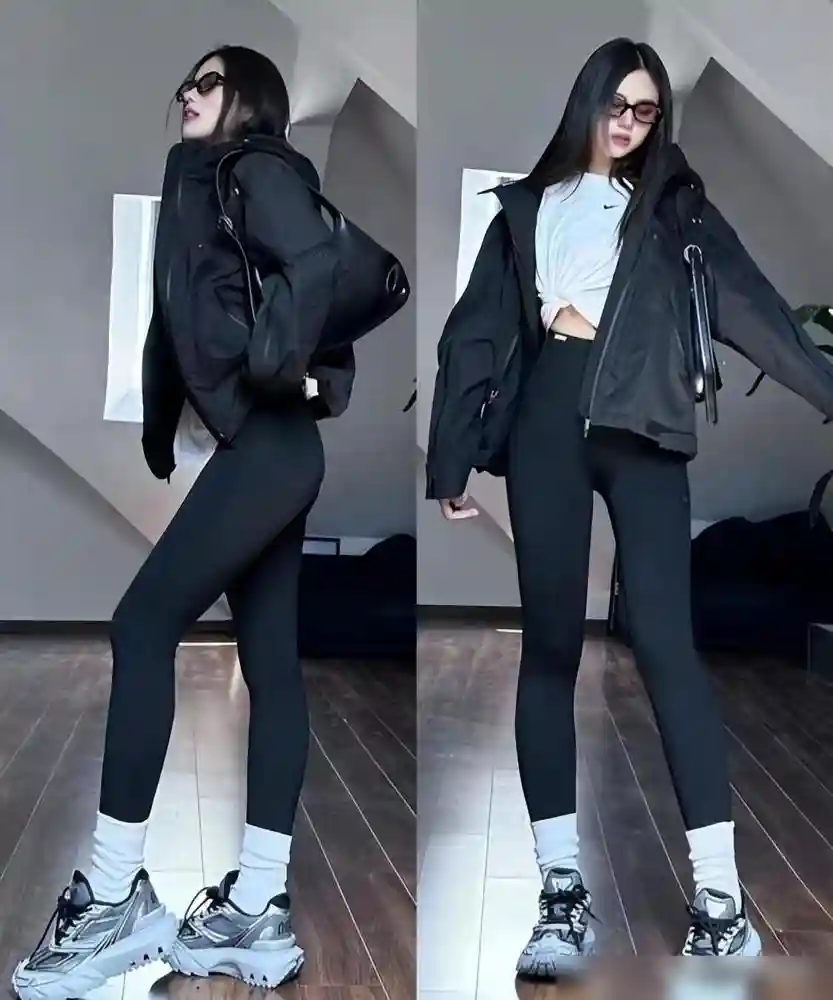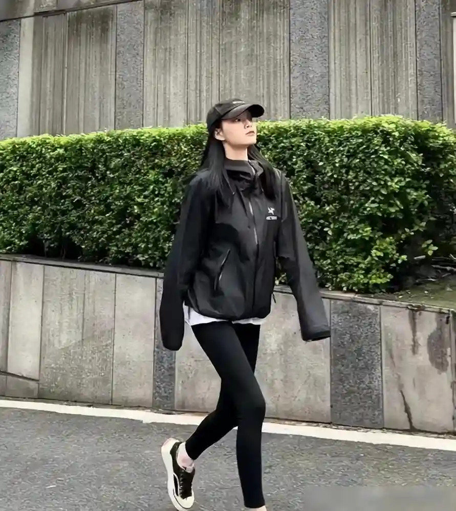 瑜伽裤本就有收腰效果搭配冲锋衣的话,更是给人一种浑然一体的感觉。