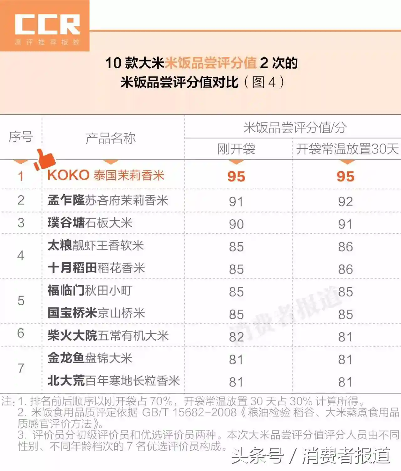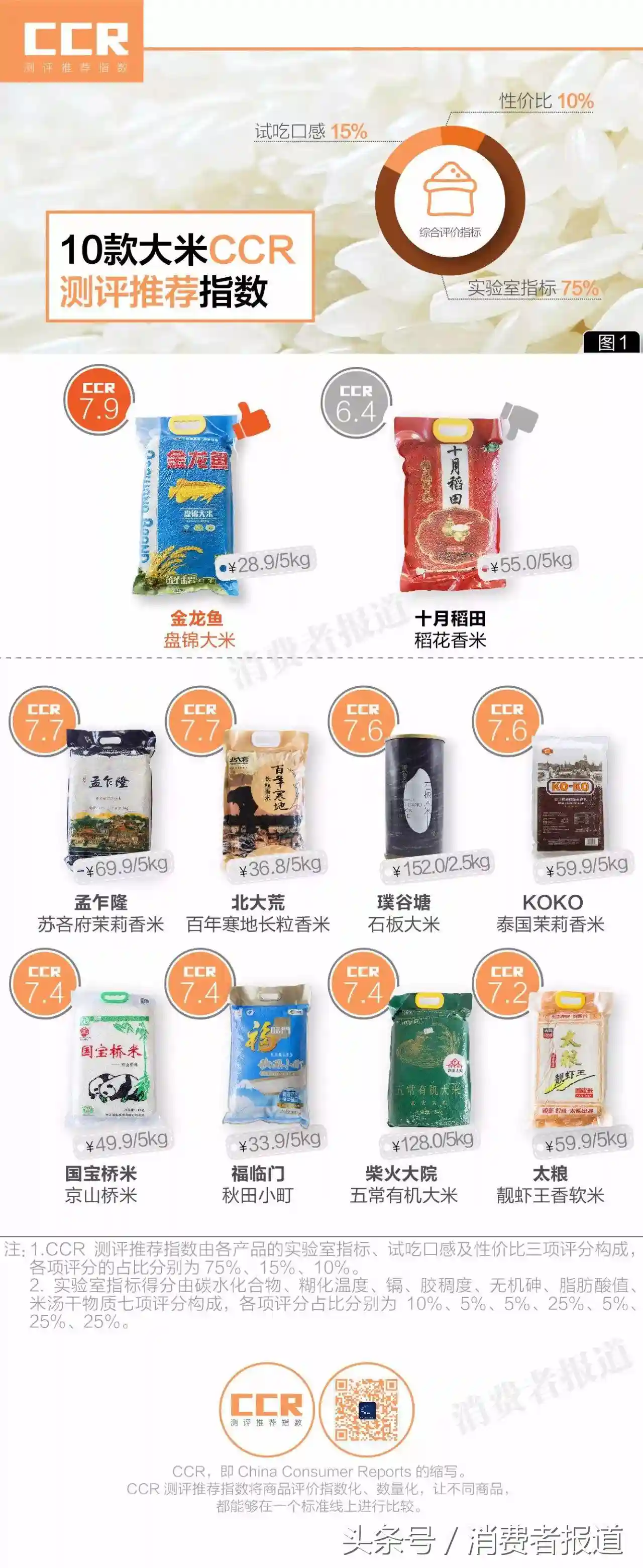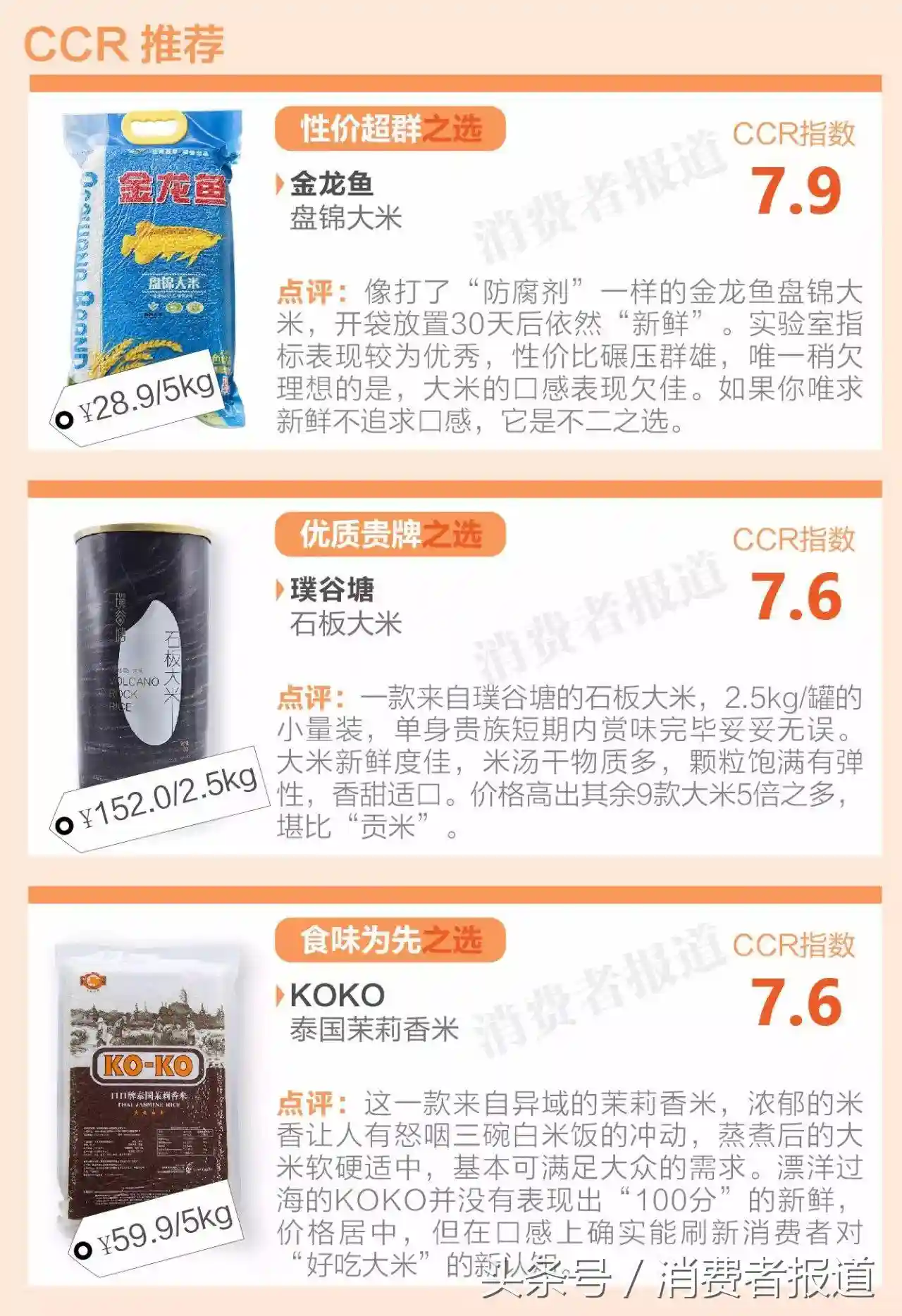 测评结果金龙鱼盘锦大米综合表现最好,且价格不高,是消费者的首选。包括璞谷塘、柴火大院在内的2款高价米与金龙鱼、福临门、国宝桥米等在内的普通米整体方面几无区别,CCR指数接近,消费者在选择时应理性选择,切勿被厂家花俏的宣传蒙骗。
