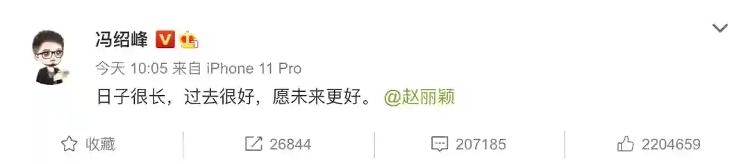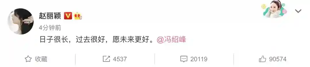 在赵丽颖工作室发布离婚消息之后,赵丽颖和冯绍峰分别在自己的社交媒体上,用相同的13个字的文案,表达了对这一事件的回应。