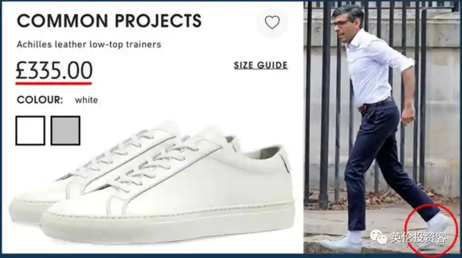 在2022年夏天的保守党党魁拉票活动中,他曾穿着Prada乐福鞋(450英镑)和前卫品牌CommonProjects的白色运动鞋(355英镑),设计也并不起眼。