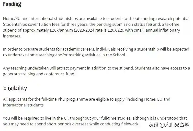 国内/欧盟和国际学生奖学金面向具有杰出研究潜力的学生。学生奖学金涵盖三年的学费、待提交状态费以及每年约20,000英镑的免税津贴(2023-2024年费率为20,622英镑),每年通货膨胀率会略有增加。