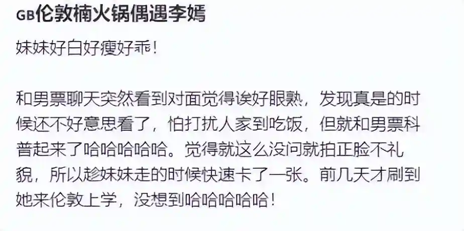 话说当天晚上7点多,几位中国游客在伦敦唐人街附近的一家火锅店用餐。突然间,他们发现邻桌坐着四位年轻姑娘,其中一位特别引人注目。这位姑娘身材高挑,长发及肩,皮肤白皙得像是会发光似的。仔细一看,可不就是咱们的李嫣小姐吗?