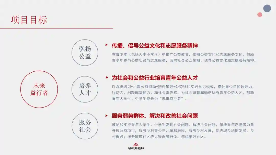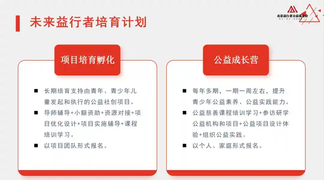 为鼓励和支持青年和青少年学生参与公益、服务社会,弘扬和传播公益志愿服务文化;提升他们的领导力、创新力和社会责任感,为社会培育未来的优秀青年公益人才,由北京益行者公益基金会等单位,于2023年正式落地实施未来益行者培育计划。