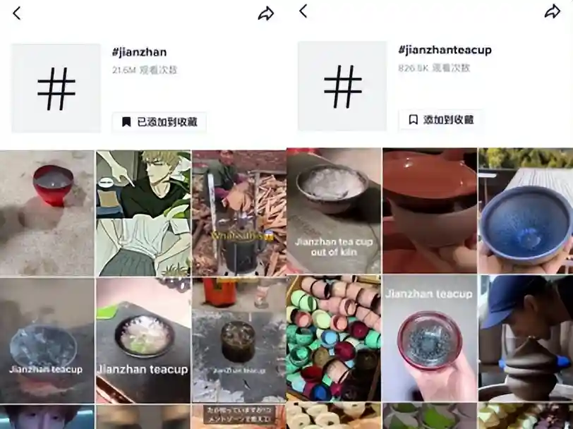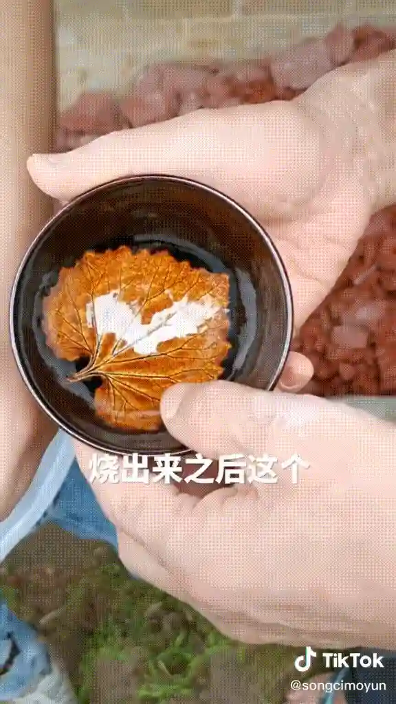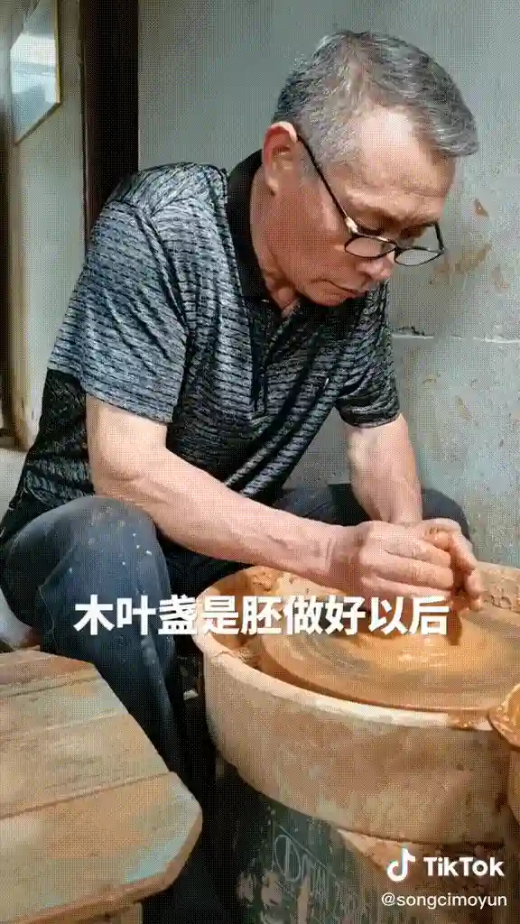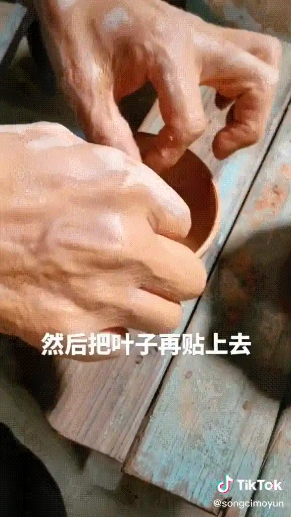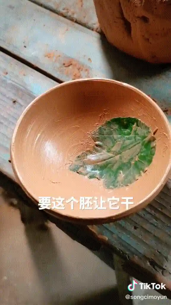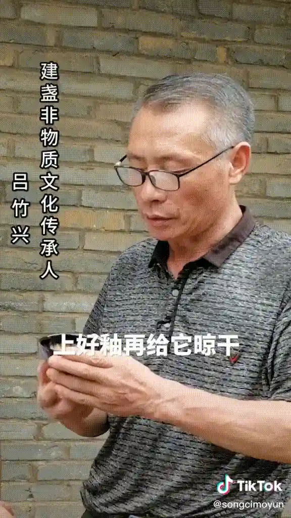 在TikTok上,网友们也得以一探建盏的烧制秘密。用户@songcimoyun分享了建窑非物质文化传承人吕竹兴烧制木叶建盏的详细过程。吕师傅演示了拉胚、上釉和烧制三大主要工序:先做好胚,再把叶子贴在盏底,到胚八成干后再上釉,上釉晾干后,碗盏被送入窑内经受最高1300度以上的胚烧。最后,一个叶脉清晰、手感丰富的建盏成型出窑。