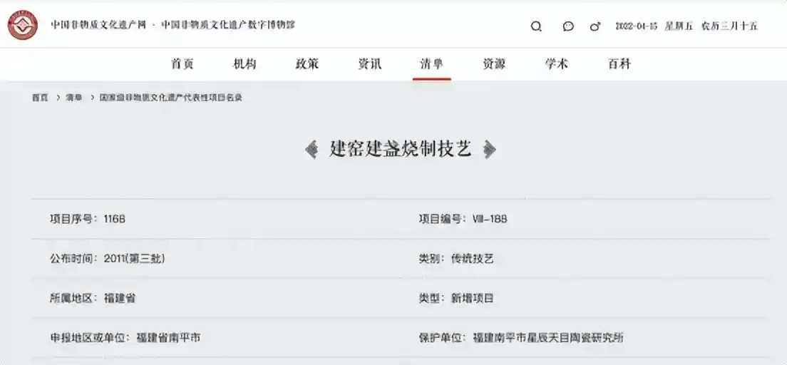 建盏是中国古代黑釉瓷的杰出代表,由中国宋代八大名窑之一的福建“建窑”烧制而成,因此得名“建盏”。由于历史变迁,建盏烧制工艺曾失传。新中国成立后,福建省开始实施恢复建窑建盏烧制技艺实践工作。经过数十年耕耘,建窑建盏烧制技艺日渐恢复与完善,并于2011年正式被列为第三批中国非物质文化遗产。