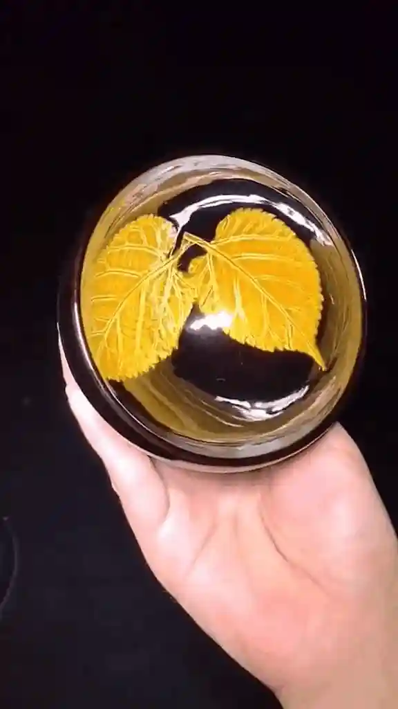 窑内被火烧得通红,开窑后,师傅将烧造好的瓷器取出,这是一支精美的杯盏,通体呈茶褐色,两片树叶被完整地嵌在盏心,叶脉层次分明、清晰可见。轻轻转动,茶盏好似晶莹剔透的水晶球。