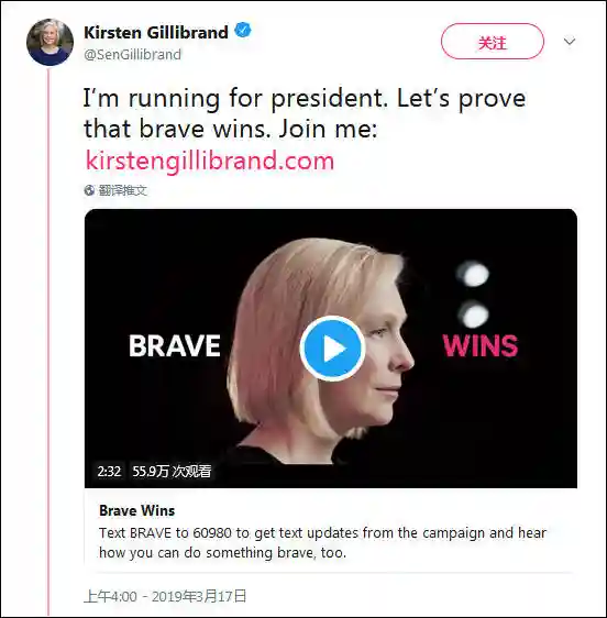 据美国有线电视新闻网(CNN)报道,3月17日,52岁的美国国会民主党议员陆天娜(KirstenGillibrand)正式宣布加入2020年总统大选的选战,成为启动总统竞选的第14位民主党人。