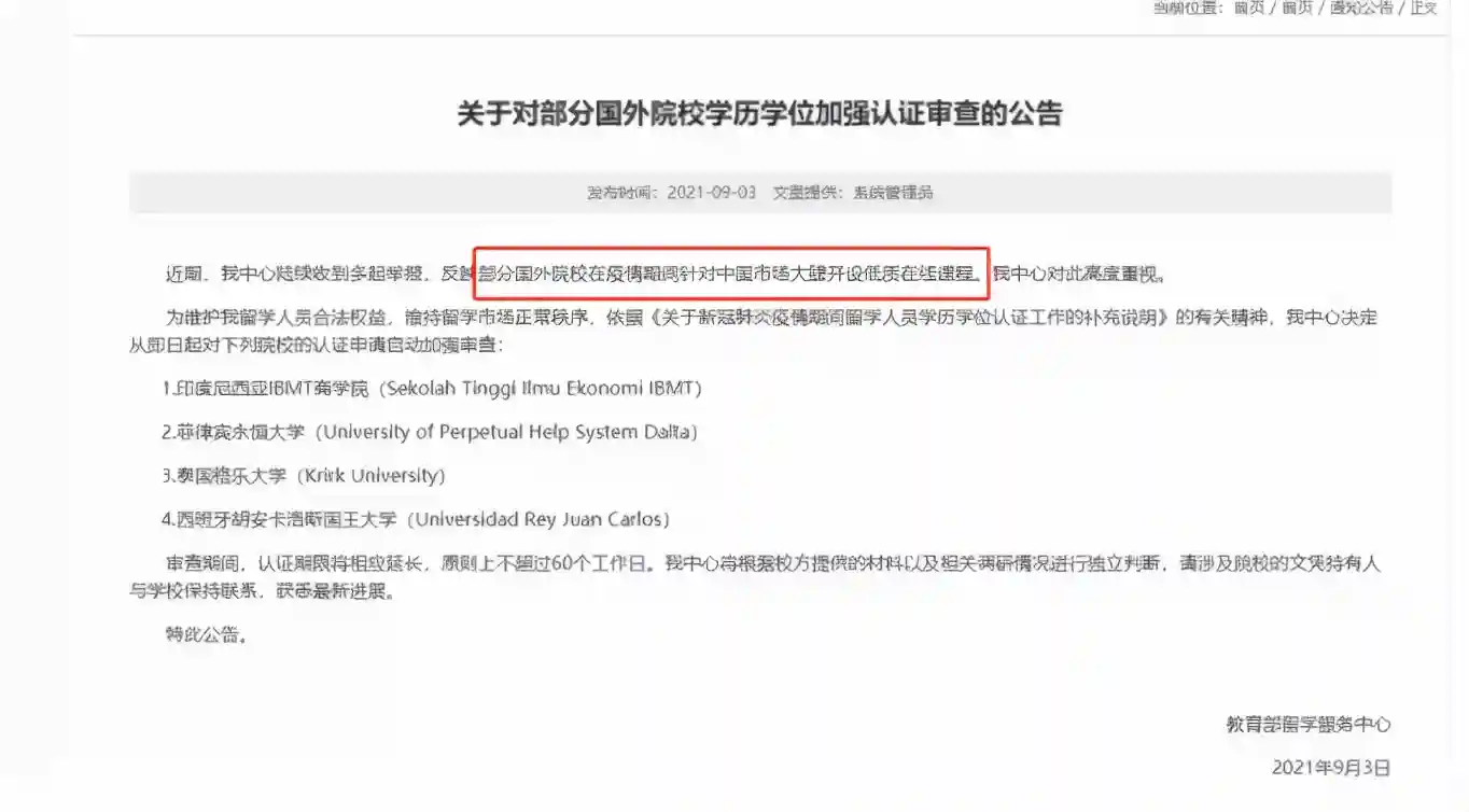 这让一些校外补课机构找到了钻空子的机会,与外国学院进行合作,通过机构完成线上课程,就能拿到国外留学学历,一时间这种模式成为拿到留学生身份的普遍方式。