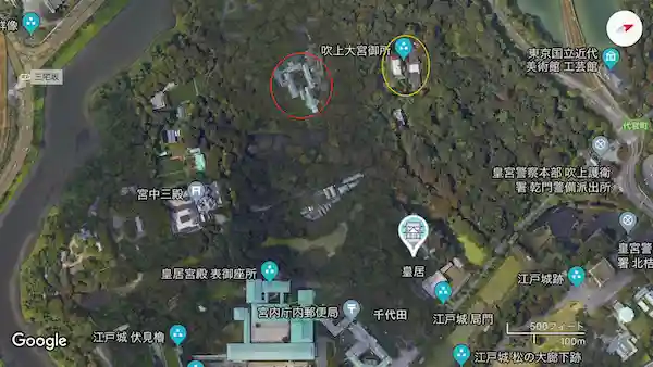 如图所示,红圈为平成时代明仁天皇和美智子皇后居住的御所(现在改称为吹上仙洞御所,在明年初搬家之前两人仍然居住在此处)。黄圈的吹上大宫御所则为昭和后期昭和天皇和香淳皇后的居所。下面天蓝色屋顶的大型建筑为厨房所在的宫殿。