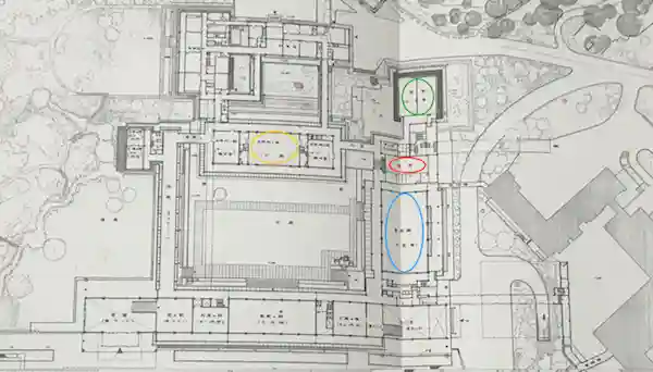 如今日本皇居中厨房的位置在哪里呢?借用一张笔者自摄的日本皇居宫殿的平面图来给大家简单说明。因为图片大小问题,图中的字可能难以辨认,其中红圈画出的位置,便是宫内厅大膳课的厨房所在地。而黄圈画出的则是本次举行即位礼正殿之仪的皇居正殿松之间的位置。