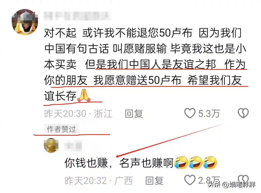 “咱这也是小本买卖,退钱是不可能退钱的,但是我们两国作为友谊之邦,可以用朋友的名义赠送你50卢布,希望我们友谊长存!”