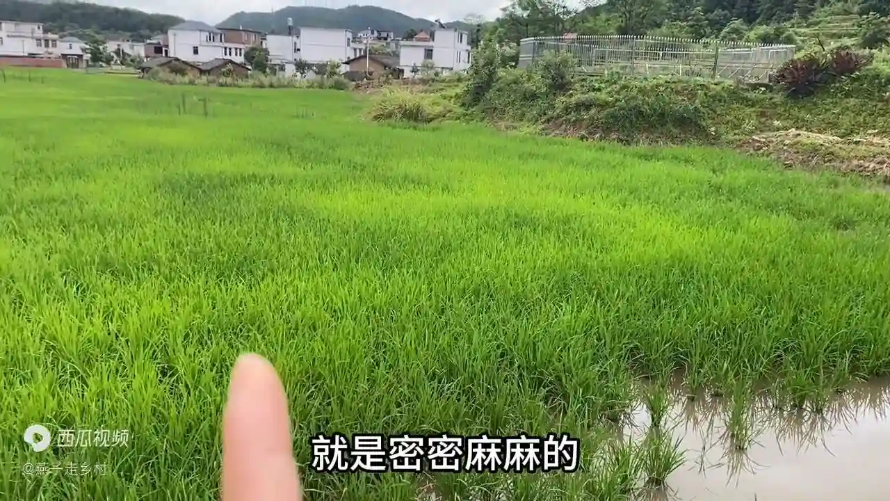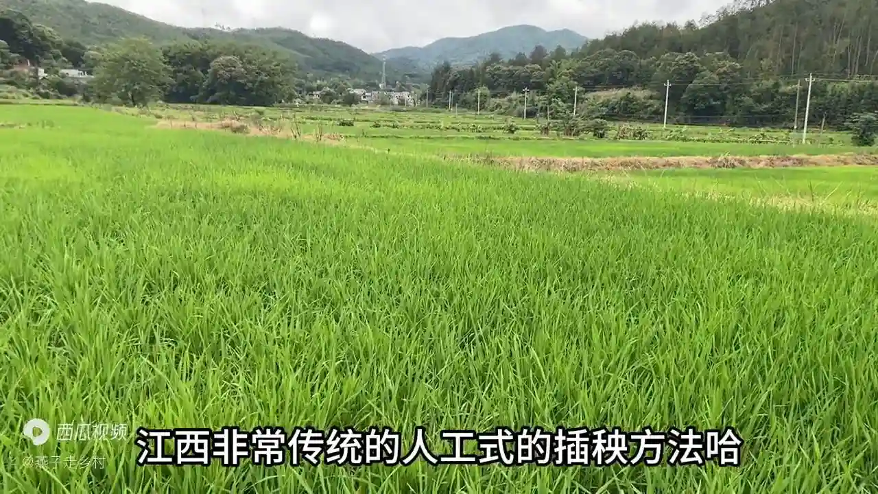 先带大家来看一下江西的插秧方法。大家看这里一大片绿油油的就是村民采用的江西非常传统的人工式的插秧方法。像这种方法就是很耗人工跟时间,但是插出来的秧苗长得特别茂盛,整一块农田都是绿油油的,每一行之间也是很整齐。