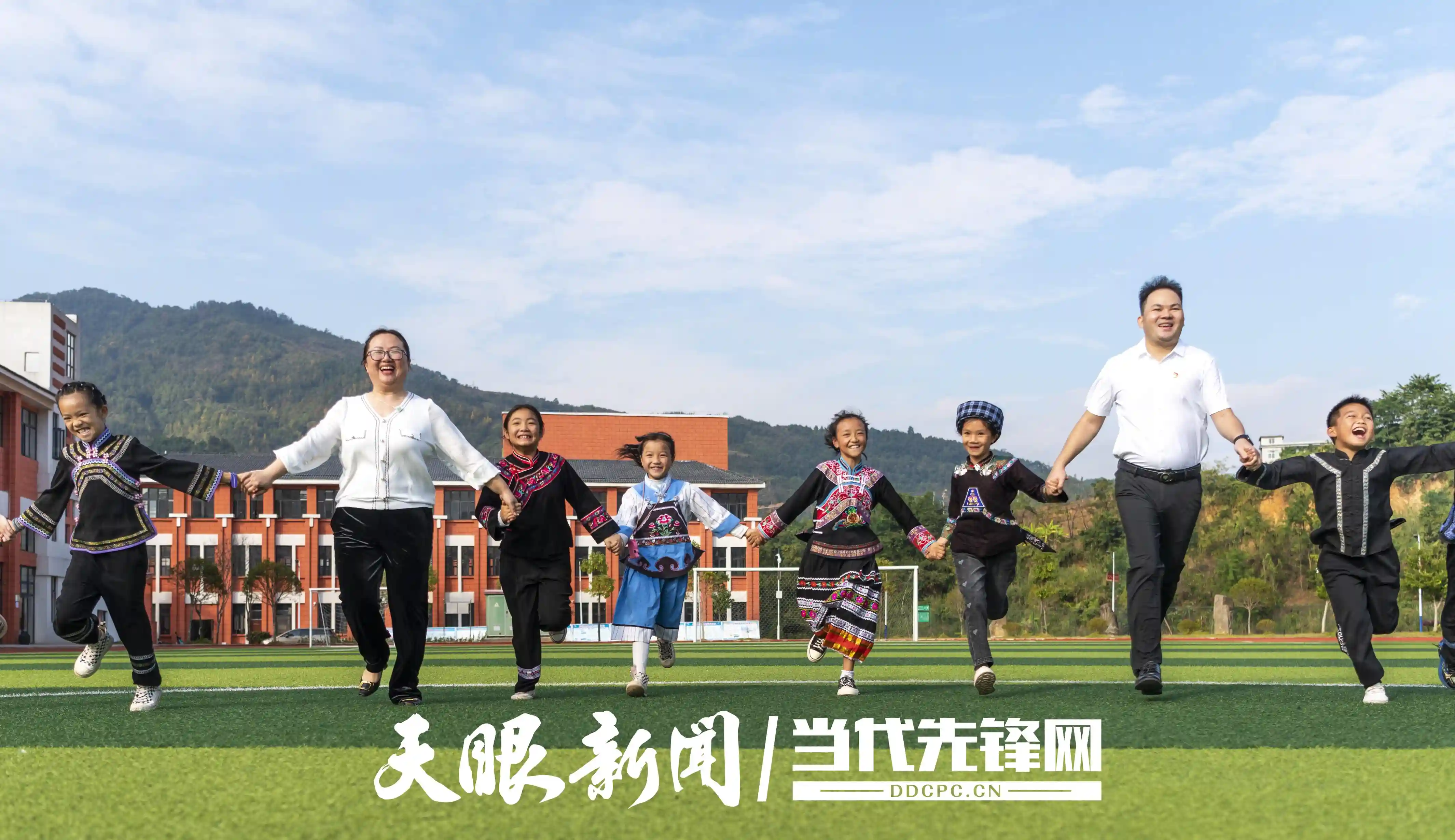 黔西南州册亨县高洛街道第一小学师生在操场上欢快地奔跑。