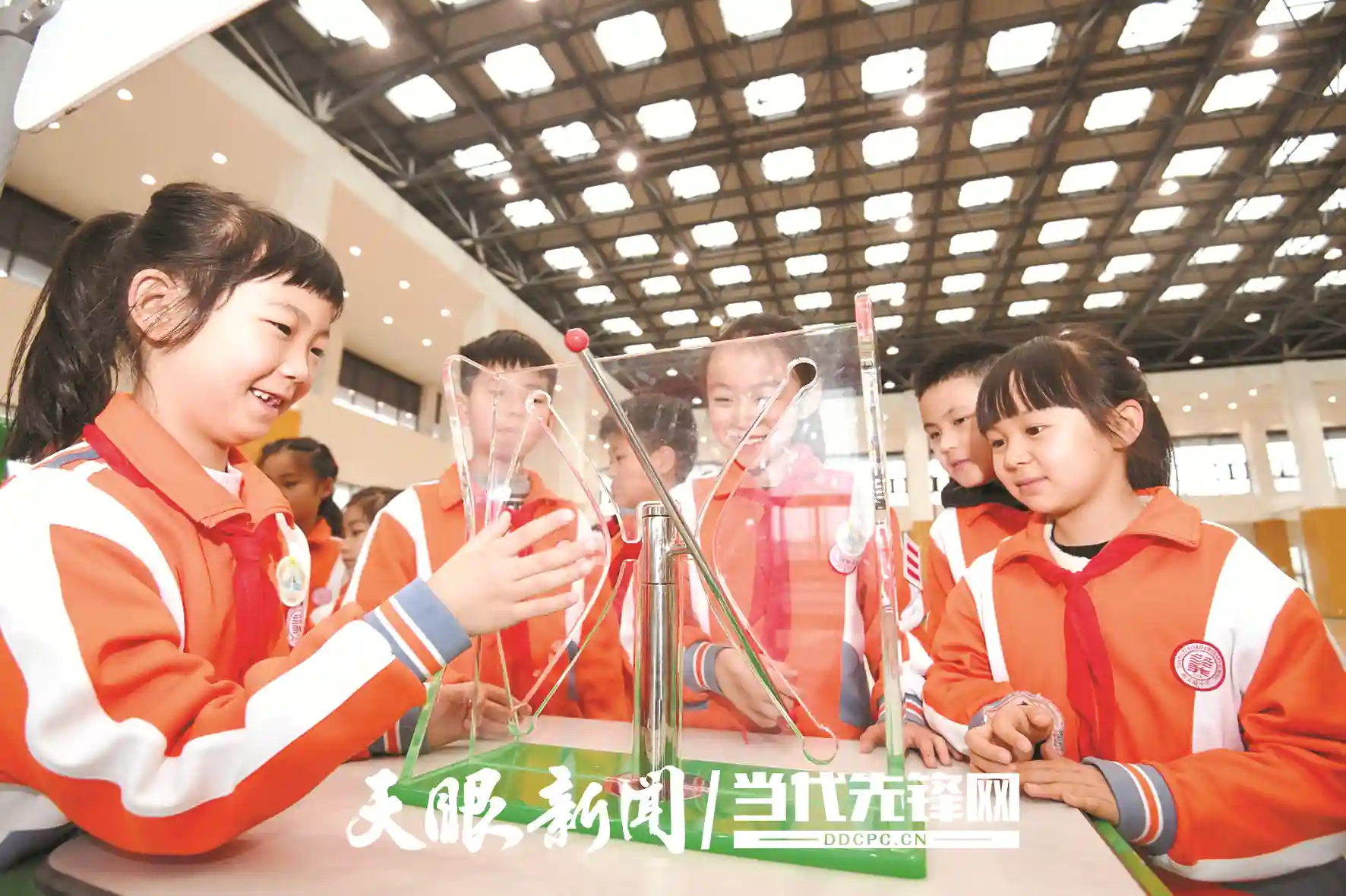 贵阳市尚义路小学学生在流动科技馆巡展现场体验“双曲线槽”科技展品。