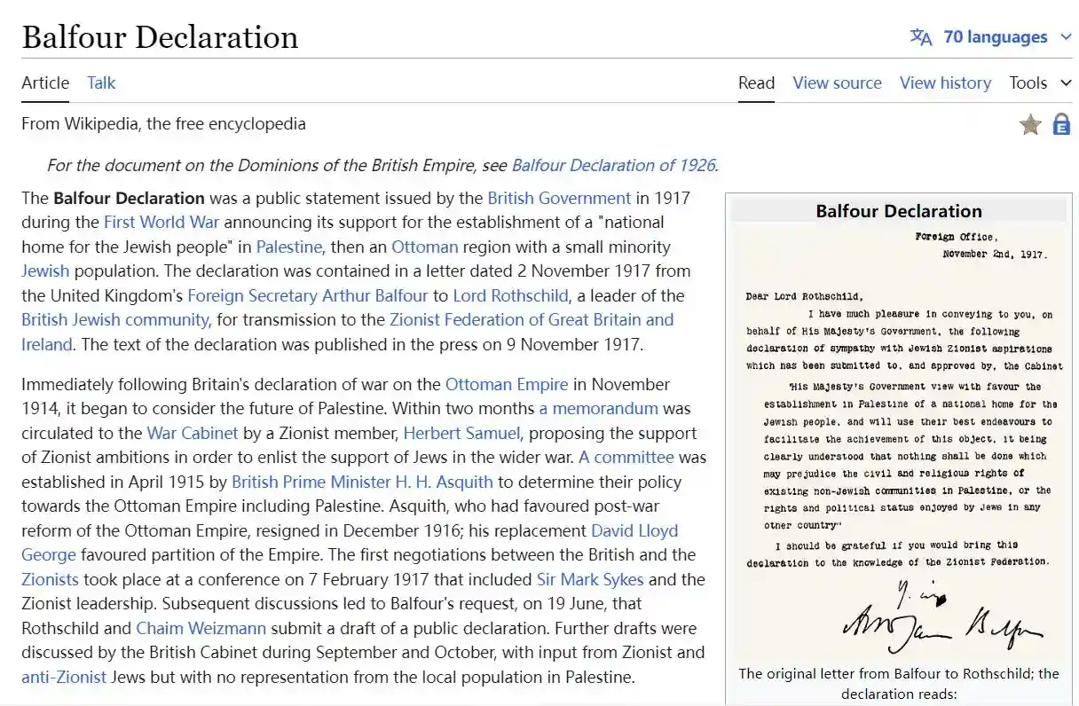 实际上,世界各地都有类似的犹太委员会,因为英国犹太委员会隶属于欧洲犹太大会、世界犹太大会。他们在英国曾经搞出许多大事情,你们还记得《贝尔福宣言》么?原本英国已经同意了巴勒斯坦的立国,可是因为英国犹太委员会罗斯柴尔德的游说,最终通过《贝尔福宣言》,宣布英国支持人口少数的犹太在巴勒斯坦地区建立以色列(下图为贝尔福宣言的介绍)。